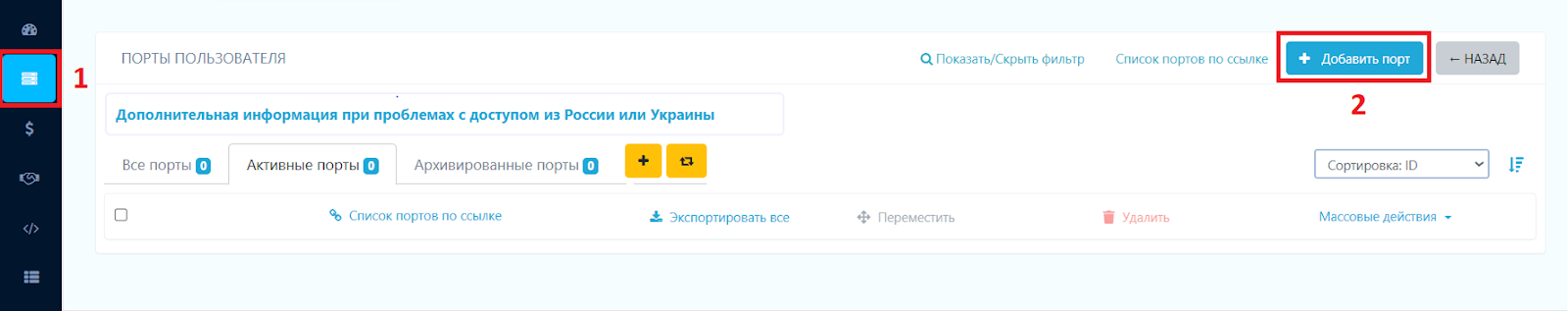 Перейдите в личном кабинете на вкладку «Мои сетевые узлы» и нажмите «Добавить порт» (нажмите «1», затем «2», инструкция ниже на скрине):