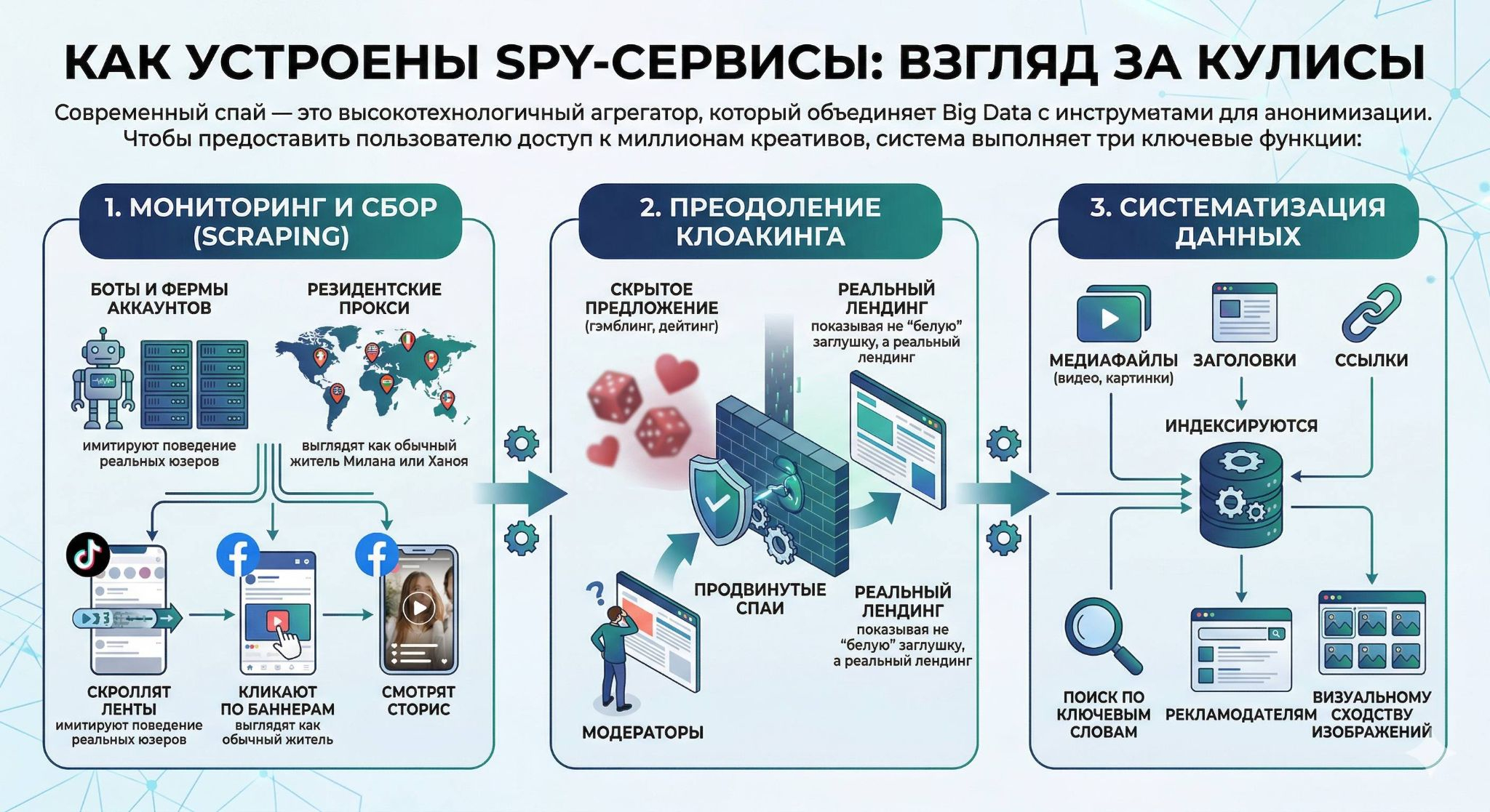 Современный спай — это высокотехнологичный агрегатор, который объединяет Big Data с инструментами для анонимизации. Чтобы предоставить пользователю доступ к миллионам креативов, система выполняет три ключевые функции: