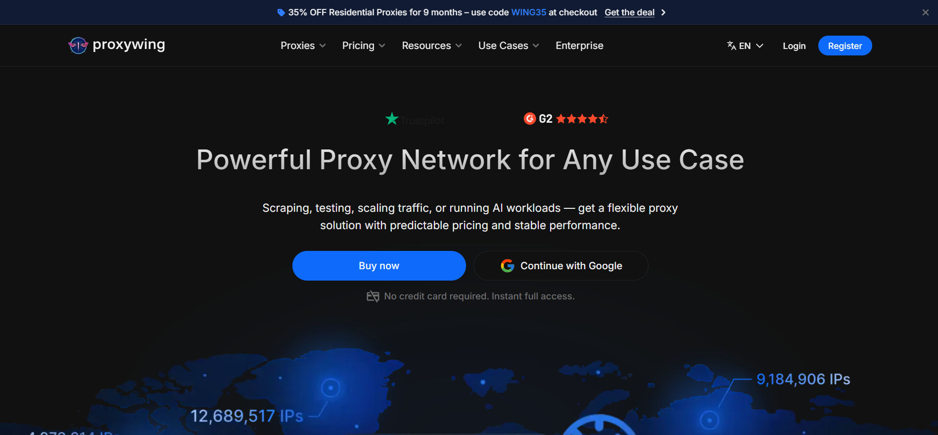 ProxyWing — провайдер, предлагающий резидентские, ISP и дата-центровые сетевые шлюзы. Сервис позиционируется для веб-скрейпинга, управления соцсетями, гейминга, работы на маркетплейсах и криптоопераций. Заявленные показатели — 99% аптайма, круглосуточная поддержка и автоматическая выдача IP-шлюзов. По данным пользовательских отзывов, пул насчитывает более 70 миллионов резидентских IP-адресов .Уникальное торговое преимущество: сочетание трёх типов сетевых узлов (резидентские, ISP, дата-центровые) под любые задачи. Для ISP-шлюзов заявляется низкий fraud-скор, а дата-центровые узлы поддерживают UDP — что важно для гейминга и массовых операций.